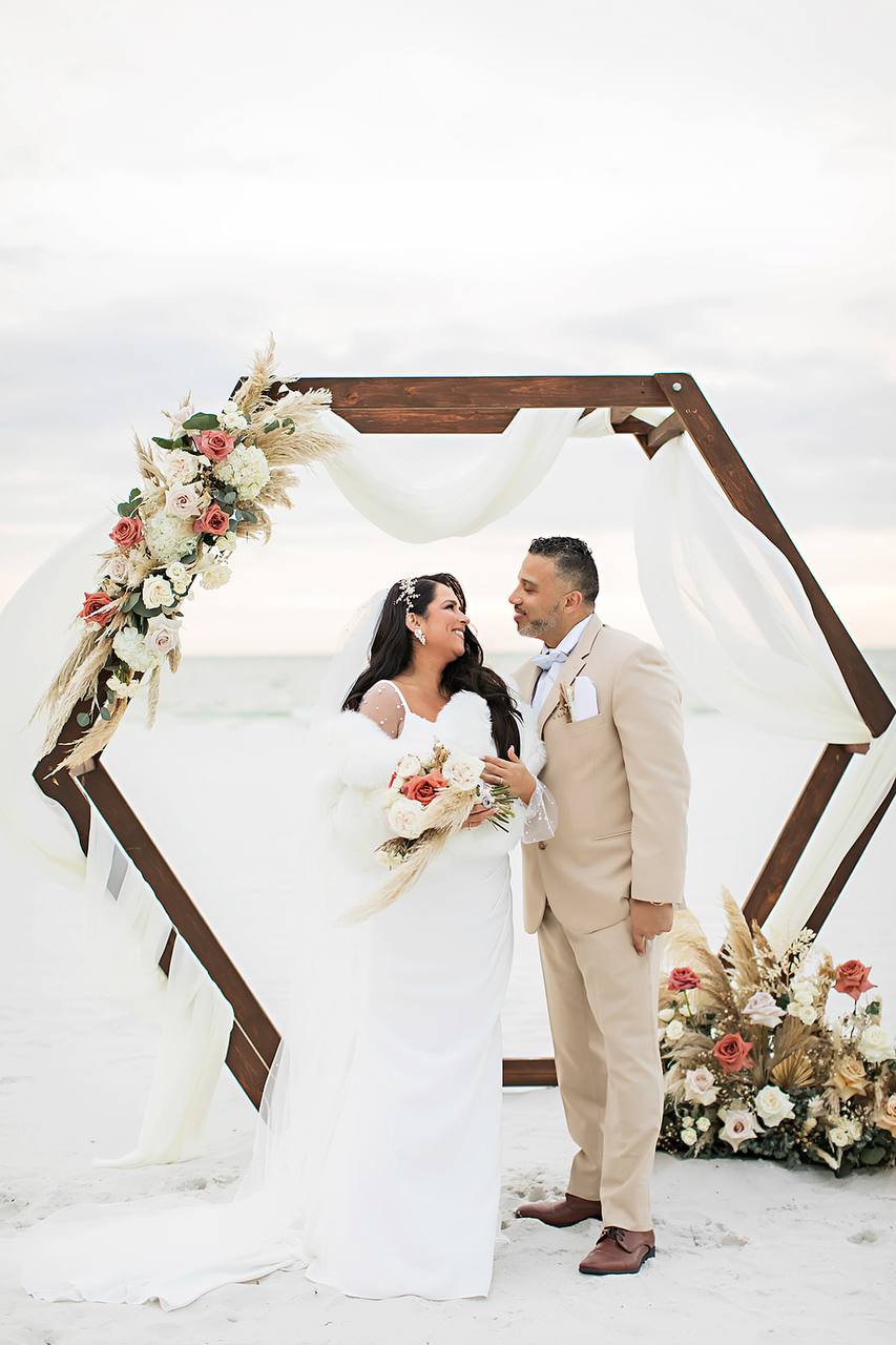 Many of our clients come in with a Pinterest board or a folder of inspiration photos. That is a good starting point. We use what you bring to build something that fits your actual wedding day, not just a photo you saved. We work with couples planning ceremonies in Dunedin, Safety Harbor, and surrounding areas throughout our delivery radius.